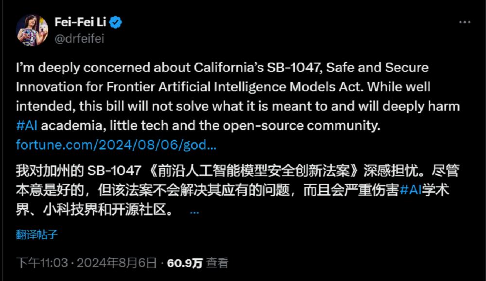 ▲李飞飞反对加州AI安全法案(图源:X平台)