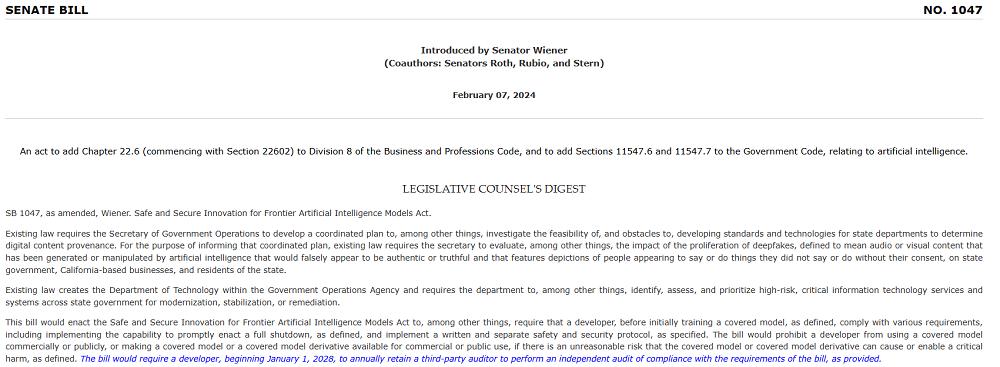 ▲加州AI监管法案部分截图(图源:加州参议院官网)