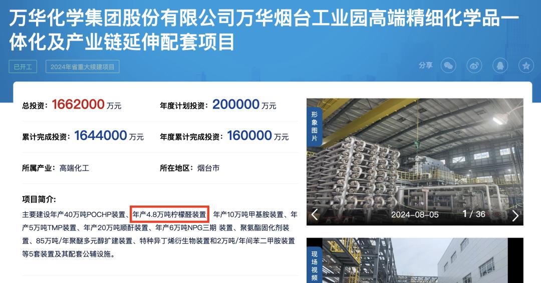 作为“牌桌上的新玩家”,项目如能顺利落地,烟台万华每年可外售柠檬醛超过2万吨。