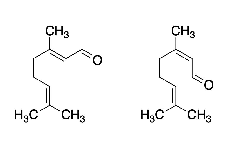 两种柠檬醛结构(右为Z式构型,左为E式构型)