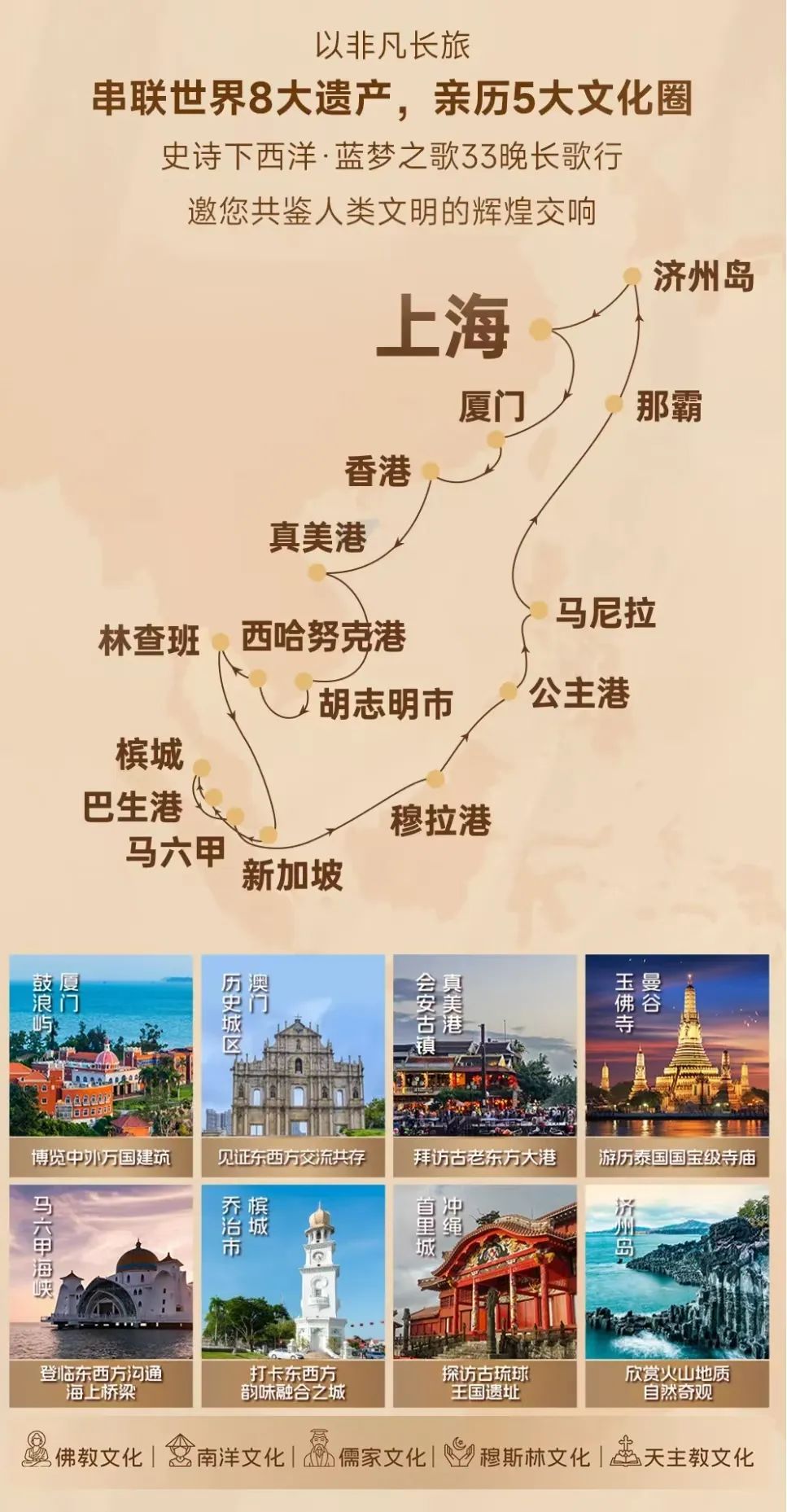 好在目前有人想冲破这一现状。比如蓝梦邮轮与“上船吧”平台共同研发的“史诗下西洋·蓝梦之歌33晚长歌行”产品。该产品致敬600年前郑和下西洋开拓海上丝绸之路,将于2024年11月26日正式开启,整体航线33晚,途径东南亚10国15港17站。