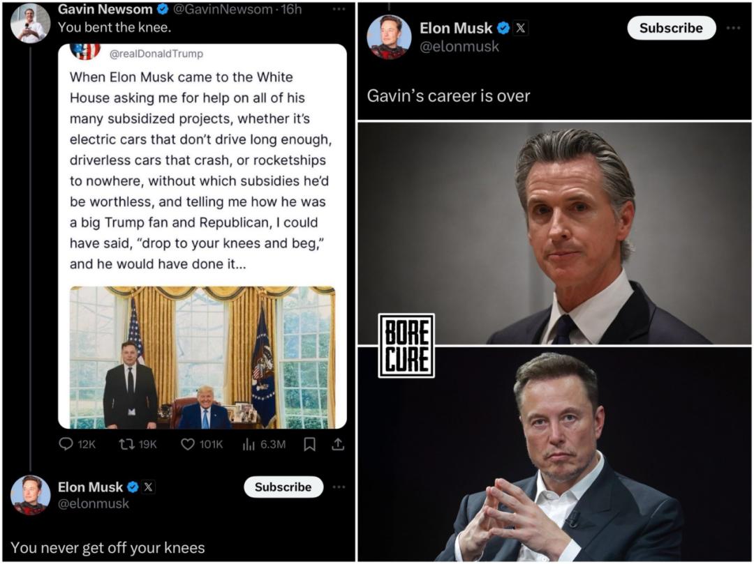 因为炮轰加州政府新法,马斯克还与加州州长纽森彻底决裂。纽森在X平台上贴出了特朗普曾经对马斯克“差点下跪”的羞辱,嘲讽马斯克已经对特朗普卑躬屈膝,而马斯克则回击纽森“从来就没有站起来过”。