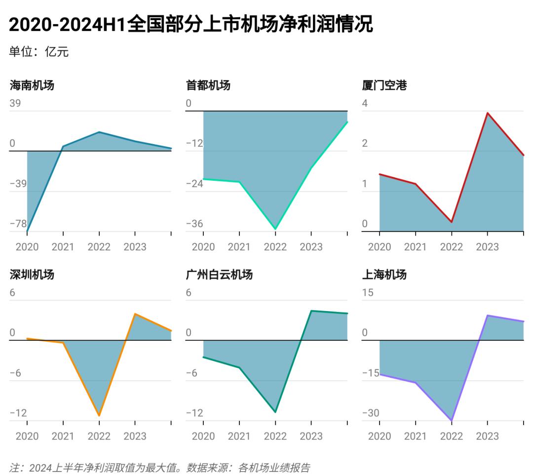 从近5年全国六大上市机场的经营状况来看,除厦门机场外,其余五家机场都有不同程度的亏损。其中,首都机场从2020年至2024上半年一直在亏损,累计亏损金额约为97亿元。