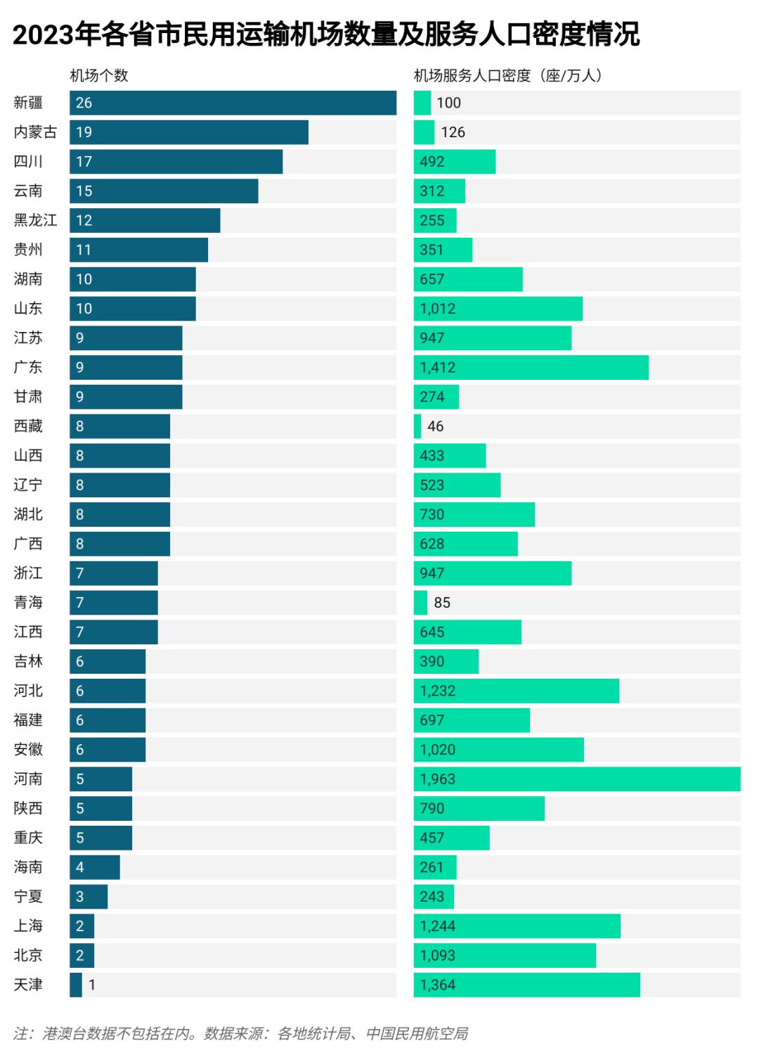 国家民航局2023年年末数据显示,全国共有259座民用运输机场,其中,新疆是民用机场最多的地区,全区共有26座机场。根据新疆机场集团的规划,到“十四五”末,新疆民用机场数量将达33个。