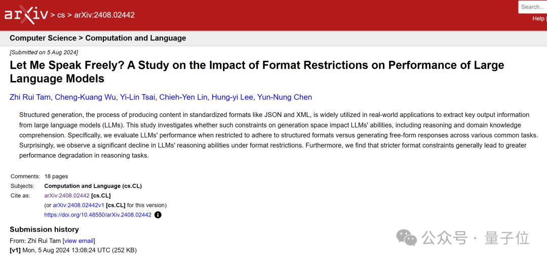 上述研究已发表在arXiv上,论文主要揭示了,在格式限制下,LLMs的推理能力显著下降,尤其是在JSON模式下。