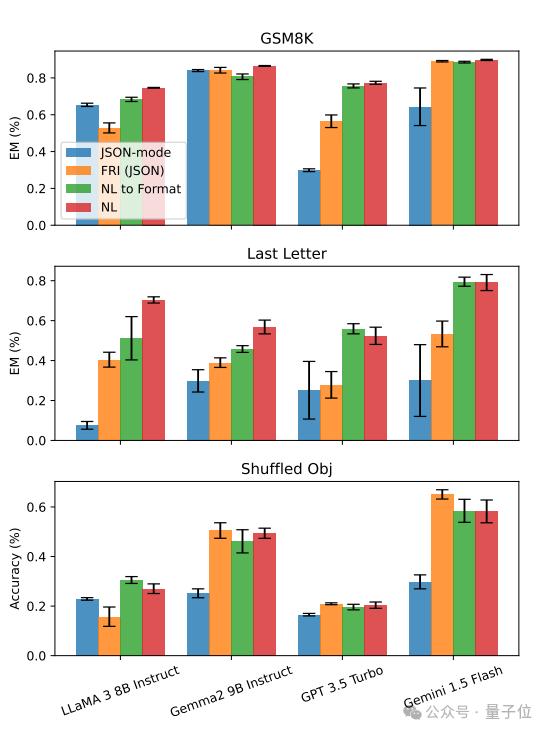 同时,JSON模式在大多数情况下表现最差,其次是格式限制指令(FRI),然后是自然语言到格式(NL to Format)转换,以及自然语言(NL)提示。