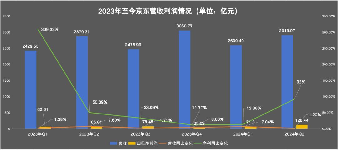 再来看京东,这一季度的收入为2914亿元,同比增长1.2%,也是2023年以来的增速最低点。