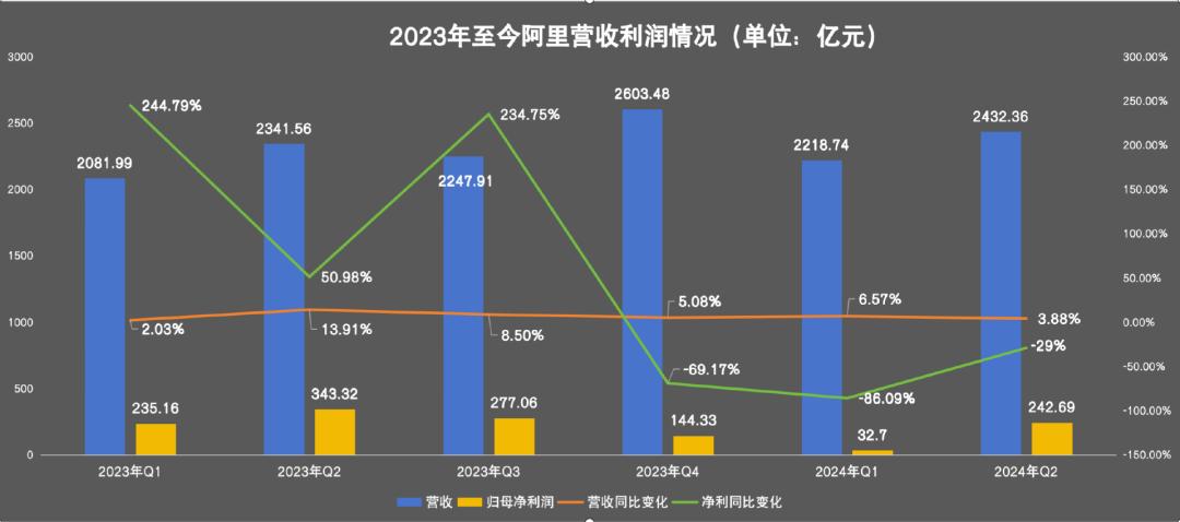 先来看阿里,这一季度的收入为2432.36亿元,这是阿里自2023年宣布进行“1+6+N”组织架构调整以来的收入增速最低点。