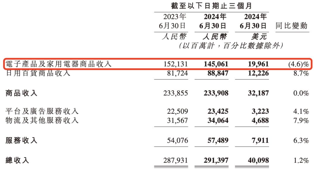本季度京东的核心品类“电子产品及家用电器商品”收入同比下滑4.6%,去年同期这一收入的增速为11.36%。京东CFO单甦在财报中解释说是受去年高基数的影响,而去年的财报中提到,京东2023年的618期间,家电家居全面升级以旧换新服务,推出了更大折扣吸引消费。