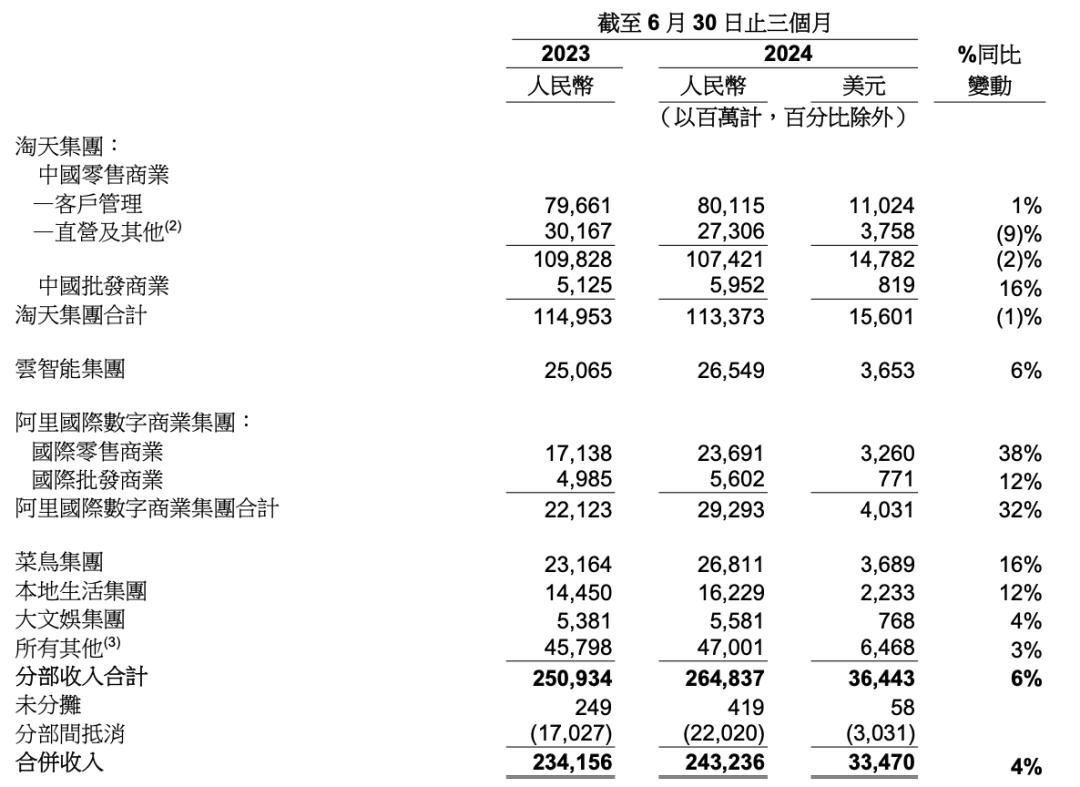 “大哥”淘天集团表现不佳,但其他业务可圈可点。蒋凡带队的国际数字商业收入涨幅最快,达32%,连带着为这一业务提供快递物流服务的菜鸟,收入增幅也达到16%,排在第二位。高德和饿了么在内的本地生活表现也不错,增幅达到12%。