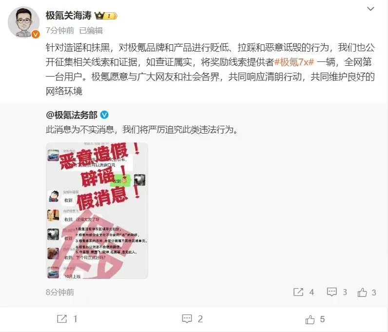 8月15日,基于网络上出现的大量不实信息及恶意诽谤、诋毁,已极大损害了极氪品牌的商誉,极氪法务部发表声明称其已报警,并将依法严厉追究所有造谣者的法律责任。