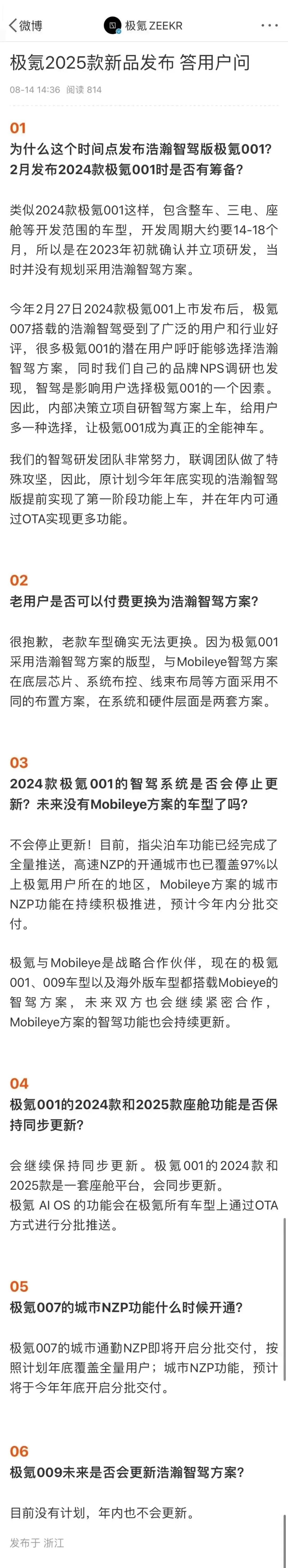 接着在8月14日晚间,处于舆论中心的极氪汽车,紧急发布了《极氪2025款新品发布答用户问》。其中明确了三点,其一,否定了在2月发布2024款极氪001时就有准备新的智驾方案上车的情况,并解释了2025款搭载浩瀚智驾方案是为了满足潜在用户的呼吁;其二,明确了老款车型无法更换浩瀚智驾系统;其三,Mobileye方案的智驾系统会持续更新,但并未正面回应未来是否还有Mobileye方案的新车。