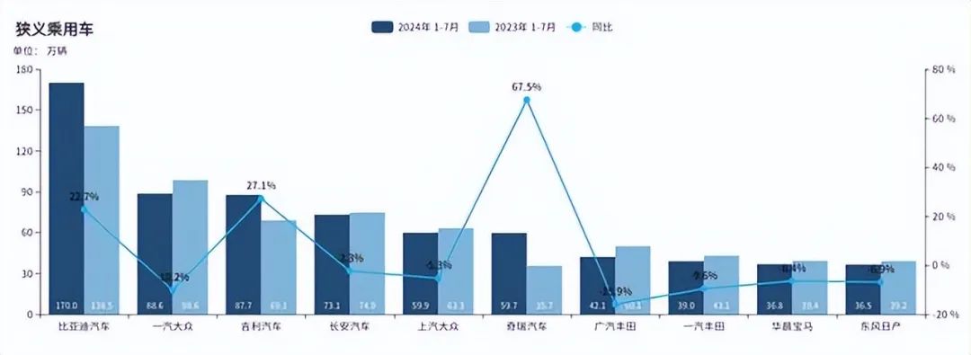 以国内2024年1-7月的零售销量前10名的品牌为例,比亚迪和吉利均实现了超过20%的销量正增长,奇瑞汽车的增幅更是高达67.5%,长安汽车小幅下跌2.3%。其他6家合资品牌均为同比负增长,降幅最大的是广汽丰田,同比下跌15.9%;就算是降幅最小的上汽大众,跌幅也有5.3%。虽然这些合资品牌都或多或少的拥有一些新能源车型,但在这场没有硝烟的战争中,合资品牌份额下跌的趋势几乎已不可逆。