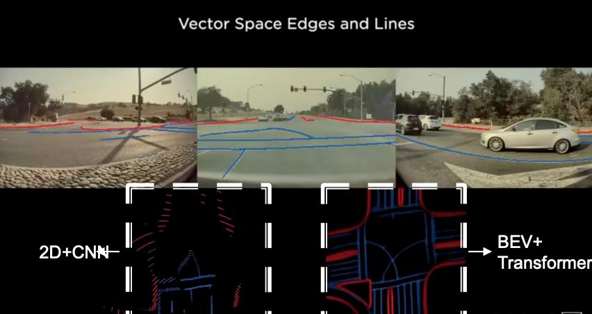 HydraNet帮自动驾驶的车辆完成了识别的工作,而对于车辆周围环境的感知则由BEV(Birds’Eye View鸟瞰视角)+ Transformer完成,两者的结合帮助特斯拉完成了将八个摄像头捕捉到的2维平面图片转换为3D向量空间的工作(也可以由激光雷达完成,但激光雷达的成本要远远高于摄像头)。