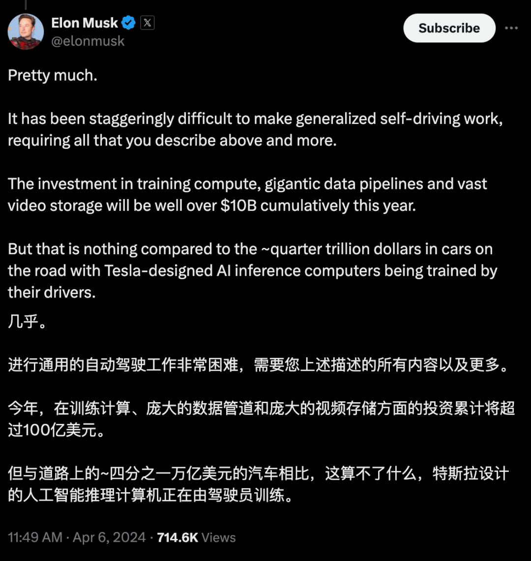 当然算力的背后还意味着巨大的资金投入,马斯克在X(原推特)上表示今年将在自动驾驶领域投资超100亿美元,也许真像理想汽车智能驾驶副总裁郎咸朋说的那样,“未来一年10亿美元只是入场券” 。
