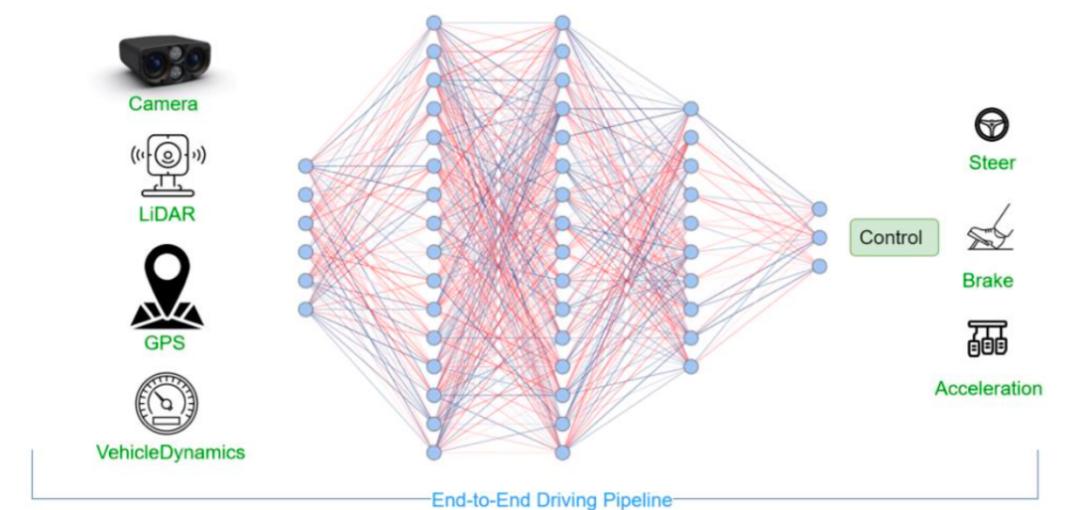 隐式的端到端算法构建整体化的基础模型,利用海量的传感器接收的外部环境数据,忽略中间过程,直接监督最终控制信号进行训练。“技术原教旨主义者”认为如图9这样的传感器信息一头进入另一头直接输出控制信号的端到端才是真正的端到端,中间没有任何额外模块。