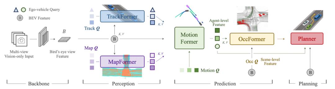 获得2023年CVPR最佳论文的UniAD模型就是采用的显式端到端,如下图所示,我们能够明显观察到各个感知、预测规划等模块采用了向量的方式进行连接。