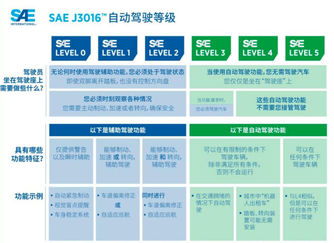 在正式开始前,我们需要对自动驾驶的整体框架有一个了解:目前被国内外广泛接受的自动驾驶分级标准是SAE(国际汽车工程学会)的分级,从L0-L5共6个级别,随着级别的上升,车辆对驾驶员手动应急接管的需求越来越小,自动驾驶系统的功能也越来越齐全,到了L4、L5级别后便不再需要驾驶员接管驾驶(理论上在这两个阶段,方向盘、踏板都无需安装)。