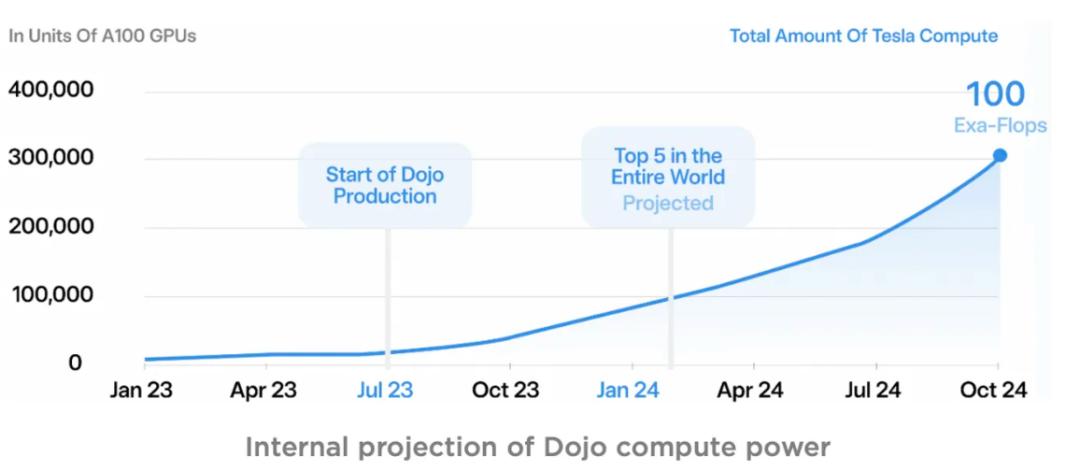 Dojo芯片投入量产后,Tesla由原先A100集群不到5EFLOPS的算力规模迅速提升到全球算力前5水平,并有望于今年10月达到100EFLOPS的算力规模,约30万张A100的水平。
