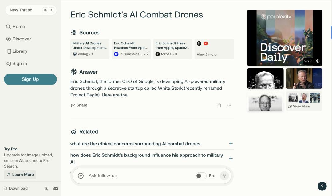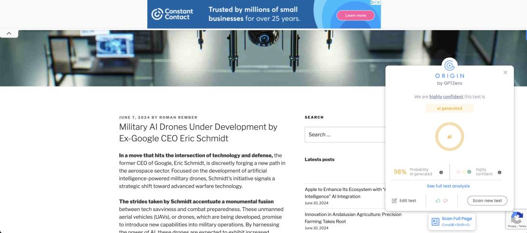 比如用Perplexity搜索“谷歌前CEO Eric Schmidt的AI无人战斗机”,谷歌引用一条信息来源(网页中文章名为《谷歌前CEO Eric Schmidt正在研发军用人工智能无人机》),其文章被检测出AI成分达到了98%。