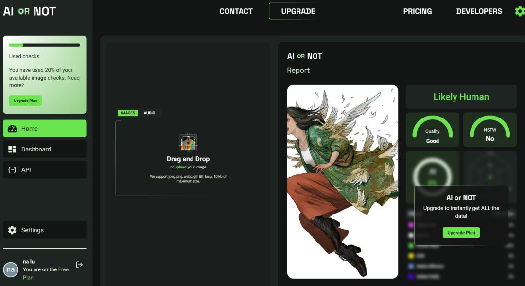 具体来说,AI or Not可以分析文本内容,识别是否由AI生成,如GPT-3或其他语言模型。图片方面,它可以利用深度学习技术检测图像是否经过AI生成或编辑,识别深伪(Deepfake)图像,也就是说,它对AI图像检测的力度更大。