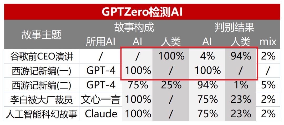 比如,在我的提示下,GPT-4创作了小故事《西游记新编(一)》,GPTZero准确地检测出AI内容(AI生成内容占比100%)。另外,对于Claude和文心一言创作的内容,GPTZero也能够得出较准确的结论。