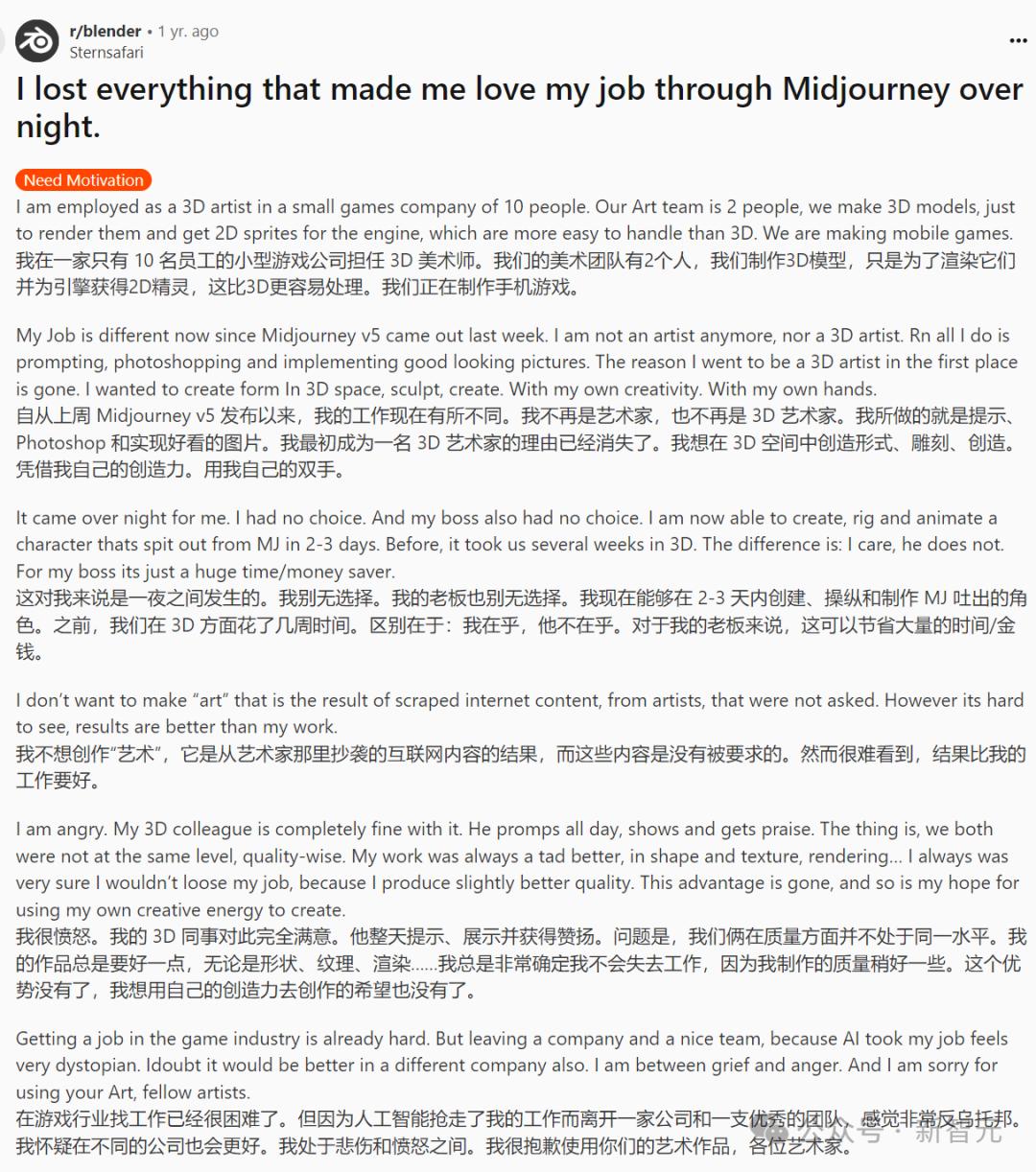 而这位3D美术师表示,自从Midjouney V5发布后,自己已经不再是艺术家了。