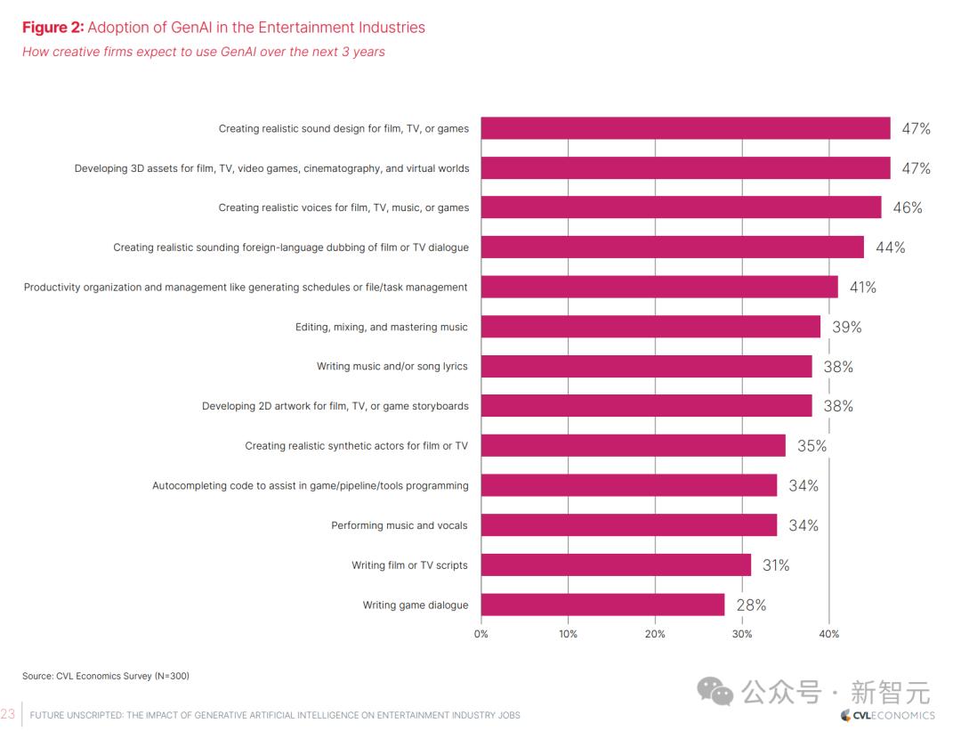 CVL报告发现,游戏「比其他娱乐行业更加依赖GenAI来执行生成故事板、角色设计、渲染和动画等任务。事实上,预计未来5到10年内,GenAI可能会参与一半以上的游戏开发过程。」