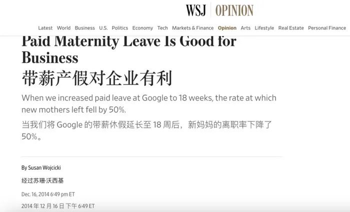 “我加入谷歌的时候正怀着孕。”沃西基在2016年为《华尔街日报》撰写的专栏文章中如是说, “有了带薪产假,妈妈们就能花时间和宝宝好好培养感情,等到重返工作岗位时,她们会感到自信和准备充分。”