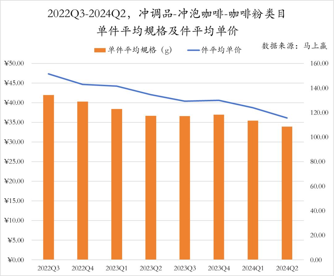 从2022年第三季度到2024年第二季度,咖啡粉品类的平均规格和件均单价均呈现出显著的下降趋势。平均规格从约150克逐步下降到110克左右,而件均单价则从约37元下降到35元。这一趋势表明,市场上推出的咖啡粉产品正在向更小包装的方向发展,对于市场份额较小的类目,可能是为了降低消费者尝新的门槛。