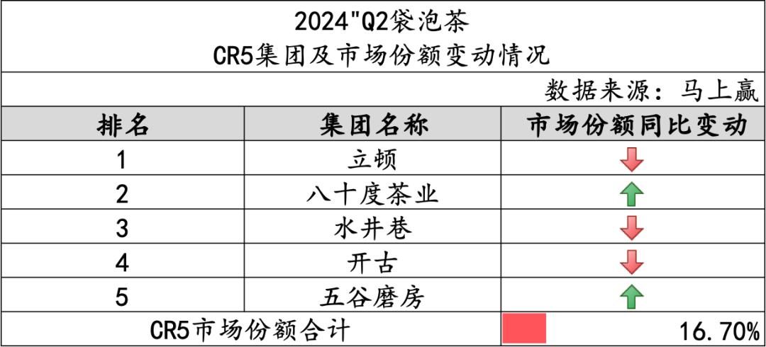 从类目CR5的情况来看,袋泡茶类目CR5合计16.70%,类目整体的集中度低。进入CR5的品牌中,立顿、水井巷和开古三个集团的市场份额同比下降,八十度茶业和五谷磨房两个集团的市场份额同比有所上升。从较低的集中度情况看,袋泡茶更像一个“只有品类,没有品牌”的市场。