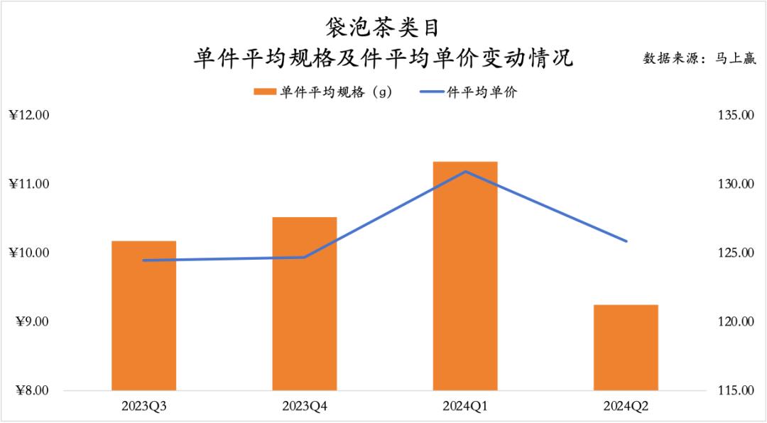 袋泡茶类目的平均规格、件平均单价走势在2024Q1为最高峰,但Q2跌至最低点,或说明类目有一定的礼赠属性。整体来看,单件平均规格与件平均单价变动均呈正相关关系。