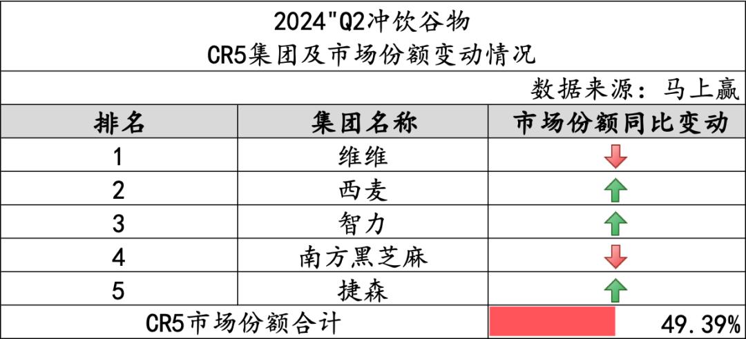 冲饮谷物整体的CR5市场份额合计49.39%,类目整体的集中度不高。在2024Q2,类目中市场份额第一的维维与第四的南方黑芝麻市场份额呈同比下跌,西麦、智力与捷森则呈现市场份额同比上涨。