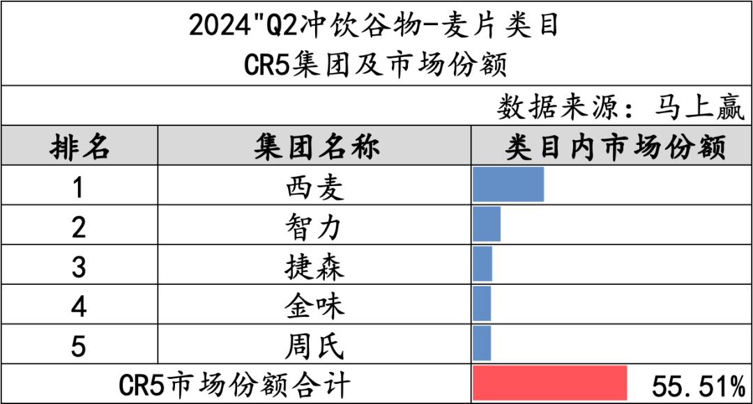 作为冲饮谷物中占比最高的四级类目,麦片类目的CR5市场份额合计55.51%,类目集中度并不高。在麦片类目中,西麦作为市场份额第一与后续几名的市场份额有较显著的差距。第二名至第五名的市场份额差距则不大,整体份额情况较为接近。