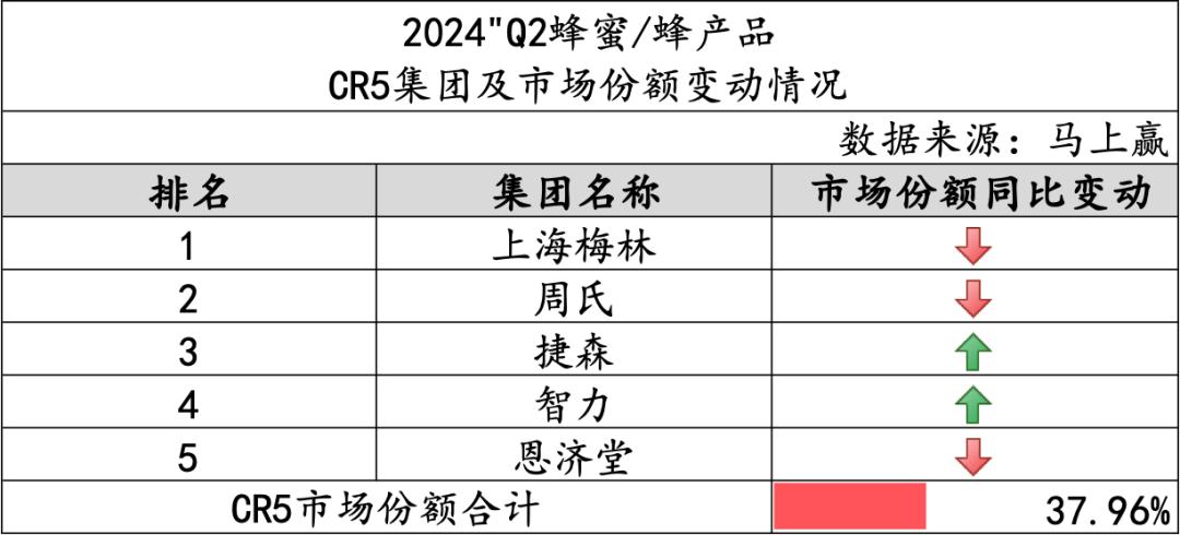 从类目CR5的情况来看,蜂蜜/蜂产品类目CR5合计37.96%,类目整体的集中度较低,消费者们对于品类的心智远远高于对类目中的品牌。进入CR5的品牌中,上海梅林、周氏、恩济堂三个集团的市场份额同比下降,捷森、智力两个集团的市场份额同比有所上升。