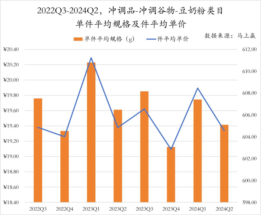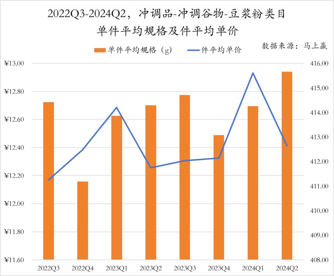 从2022年第三季度到2024年第二季度,豆奶粉类目的平均规格和件均单价表现出一定的季节性波动。特别是在2023年和2024年第一季度出现小波峰,反映了春节期间消费者对礼赠场景的需求更为强烈,品牌通过提高规格和单价实现了更高的溢价能力;而在其他时间段,单价则保持相对稳定,同时规格在下降。