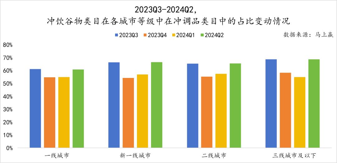 从城市等级上看,类目在各城市等级中在冲调品类目中的占比差距不大,一线城市整体的占比略低于新一线城市与三线城市及以下。同时,与业态情况类似,整个类目在各个城市等级中在Q2、Q3的占比情况均好于Q4、Q1,类目受冲调品类目整体的季节性影响较为显著。
