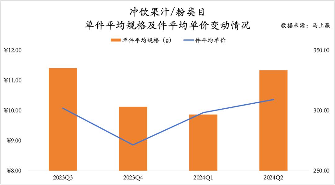 冲饮果汁/粉类目的平均规格、件平均单价走势也体现了其一定的季节属性,在Q2和Q3天气较为炎热的时段,类目整体件平均规格、平均单价均较高,且变动均呈正相关关系。