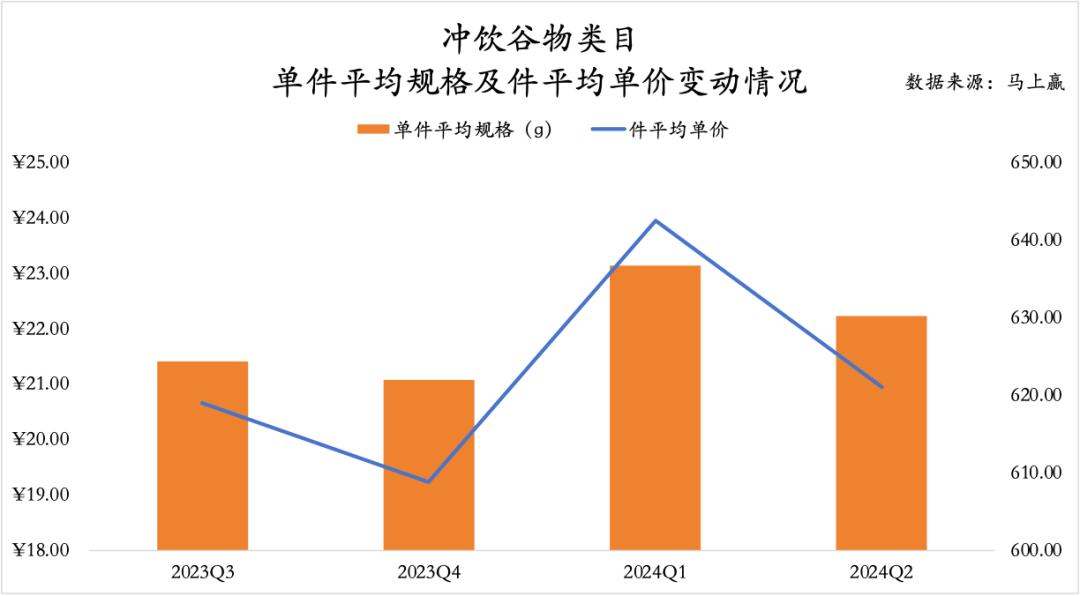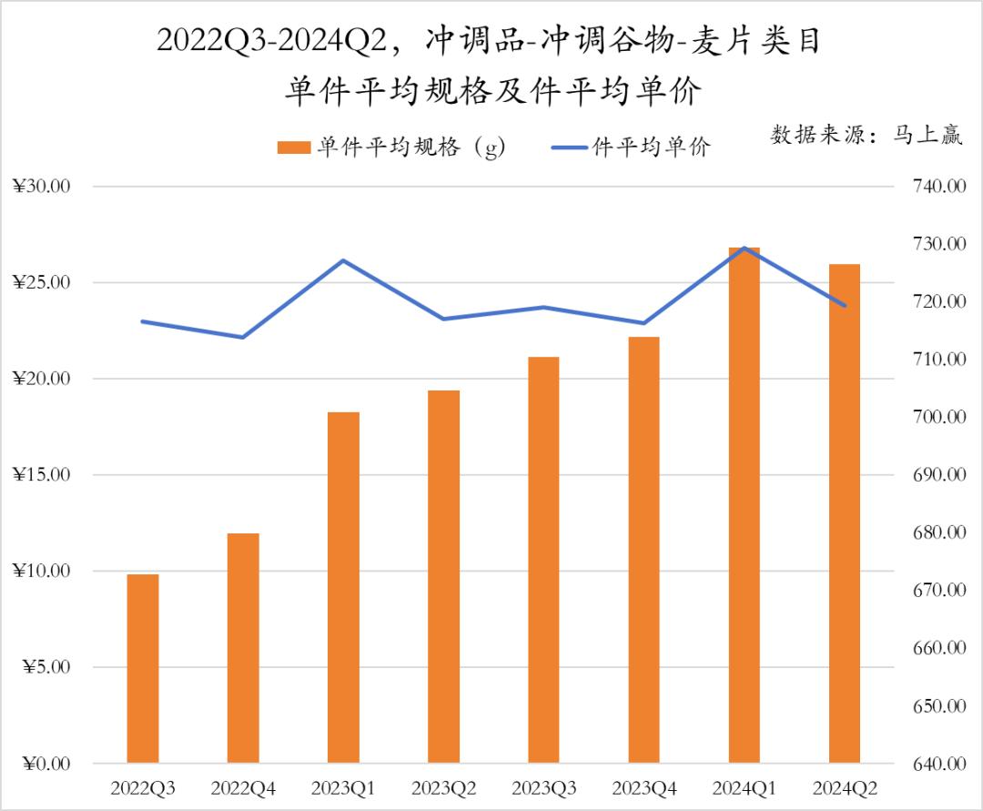从麦片类目的件均规格与件均价格走势上来看,从2022Q3-2024Q2,整体类目的件均规格有较为显著的上涨,且一直处于上涨通道中,但与之相对的,类目的件均价格则没有显著的变化,基本维持稳定。