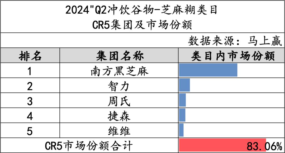 在2024年第二季度,芝麻糊类目的CR5市场份额达到了83.06%,展现了市场的高度集中。南方黑芝麻在这一领域占据着主导地位,市场份额远远领先于智力、周氏、捷森和维维等其他品牌。尽管这些品牌在市场中也有一定影响力,但与南方黑芝麻相比,差距明显。