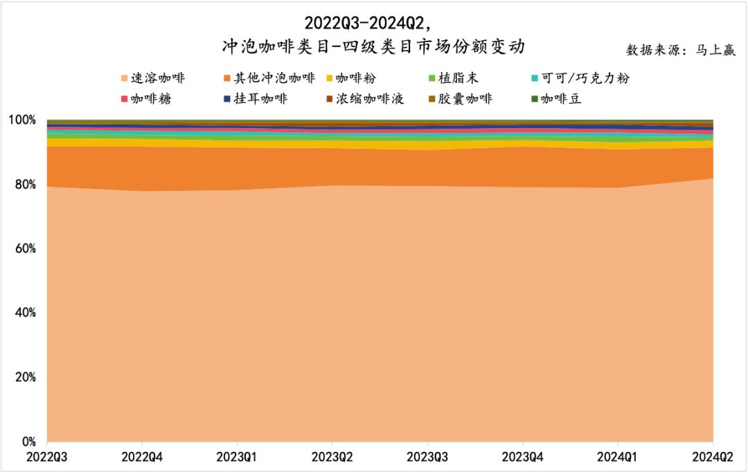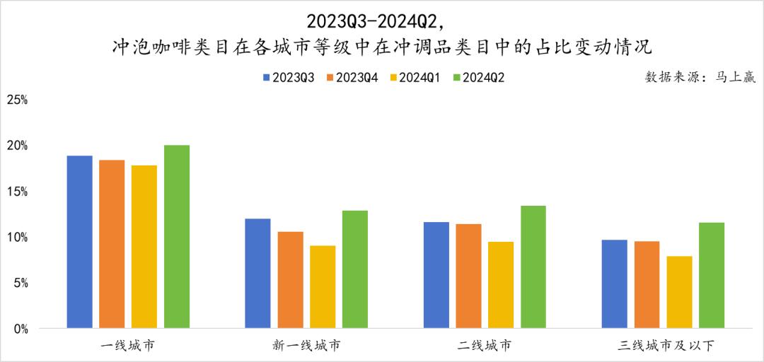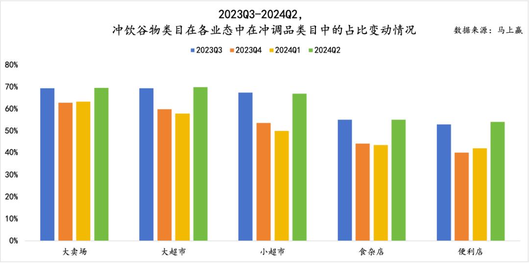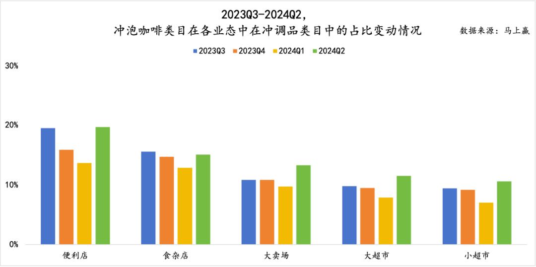 此外,整个冲泡咖啡类目在各个业态中的表现具有明显的季节性特征。在2024年第二季度和第三季度,冲泡咖啡在冲调类目中的占比情况优于第四季度和第一季度。