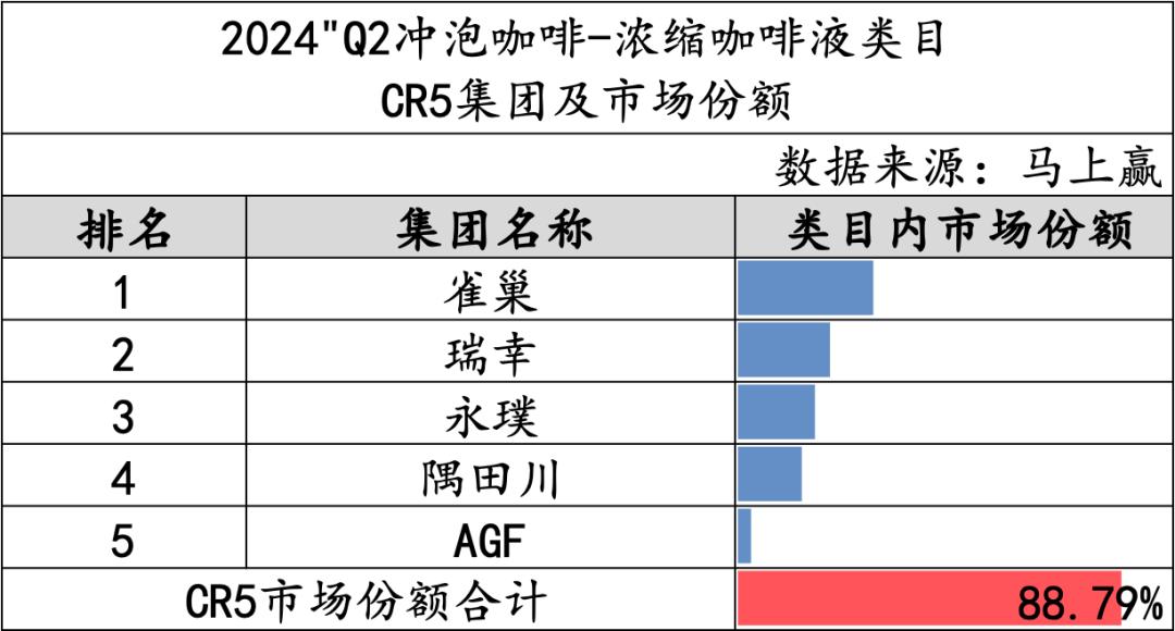 浓缩咖啡液市场在2024年第二季度表现出较高的集中度,CR5的市场份额达到了88.79%。其中雀巢集团位居榜首,紧随其后的是瑞幸,作为新兴品牌在市场中占据了重要的位置。