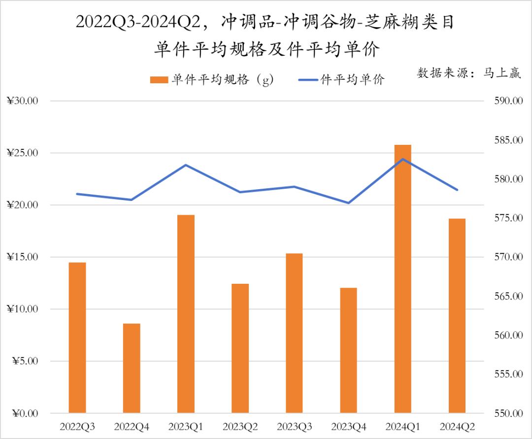 从2022年第三季度到2024年第二季度,芝麻糊类目的平均单价相对稳定,而平均规格则出现了较为显著的上升。这说明品牌在价格保持平稳的情况下,通过提升产品规格、降低克单价来增强市场吸引力,以满足消费者对更高性价比的需求。