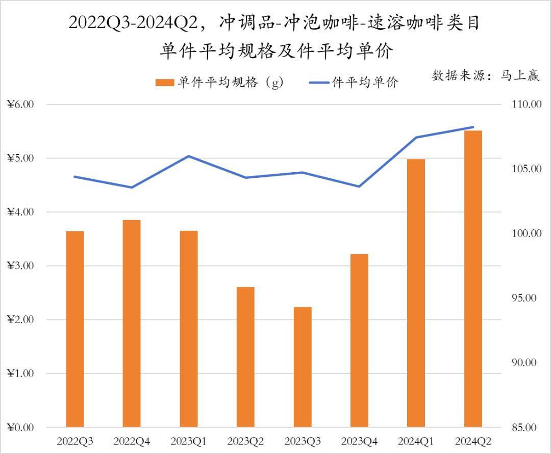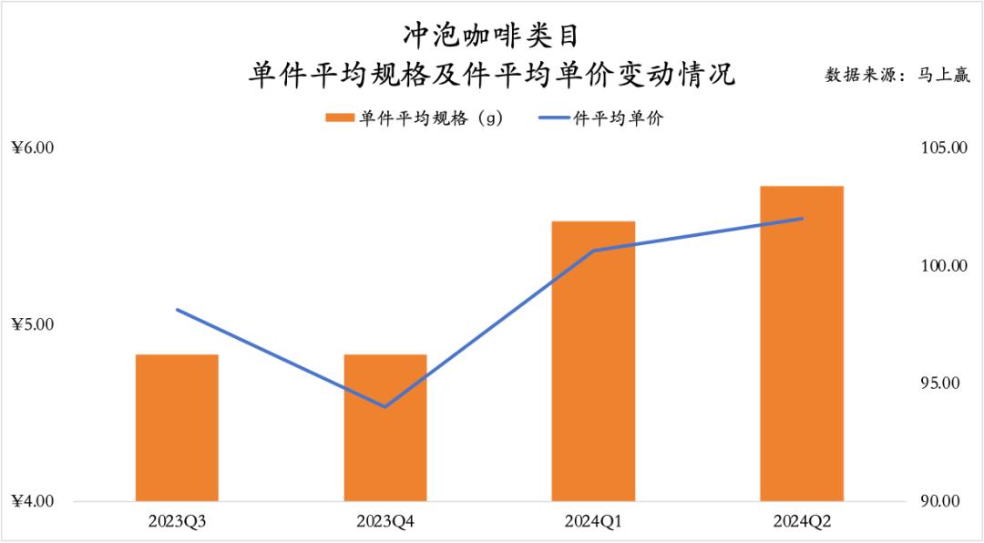 2023年第三季度到2024年第二季度,冲泡咖啡品类的平均规格和件均单价呈现出显著的上涨趋势。特别是从2023年第四季度开始,规格和单价均出现了稳步上升,到2024年第二季度达到了新的高点。这一趋势表明,市场对更大容量产品的需求正在增加,而品牌也通过提高规格和单价来适应这一趋势,推动整体销售额的增长。