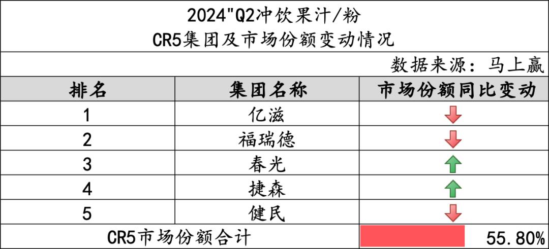 从类目CR5的情况来看,冲饮果汁/粉类目CR5合计55.80%,类目整体的集中度不高。进入CR5的品牌中,亿滋、福瑞德和健民三个集团的市场份额同比下降,春光和捷森两个集团的市场份额同比有所上升。
