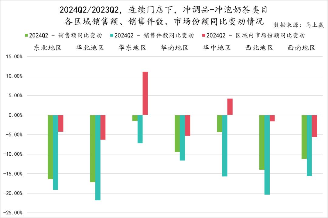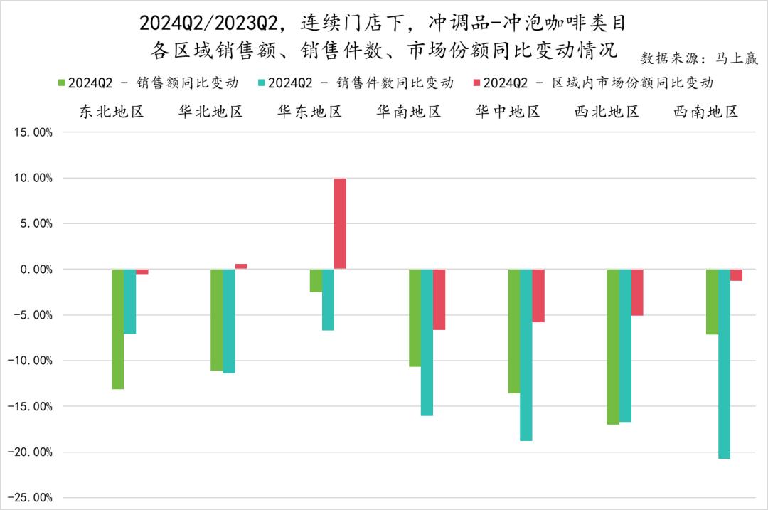 基于马上赢品牌CT中的连续门店数据分区域来看,冲泡咖啡品类的市场份额仅在华北与华东地区的冲调品类目内有所提升,并且,销售额、销售件数在所有地区均有不同程度的下降:东北地区销售额下滑显著超过销售件数,华北、西北地区销售额、销售件数下滑幅度相近,其他地区销售件数下滑幅度显著超过销售额,说明在这些地区平价产品受影响更大。