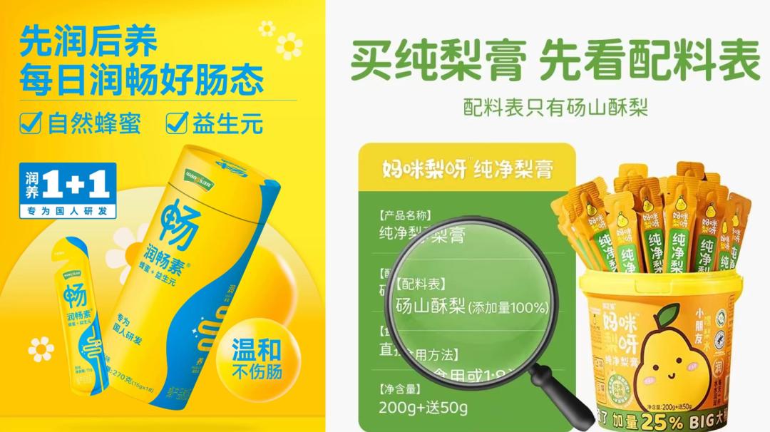 汪氏润畅素搭配蜂蜜+益生元,突出“肠道健康”概念,小条装更便捷;梨花猫秋梨膏,抓住当下消费者对于呼吸道健康的特别关注,将传统上被认为“润肺清心”秋梨膏标准化生产,精简配料表的同时使用小条装便捷包装……这些产品克单价并不算低,但也获得了市场的认可。