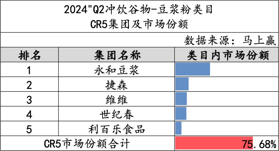 豆浆粉类目中CR5的市场份额达到75.68%,集中度较高。其中耳熟能详的永和豆浆占据了榜单第一,稳居该品类的领军位置,与第二名的捷森拉开了超过一倍的差距。第二名至第四名的市场份额差距不大,整体份额情况较为接近,利百乐食品排名第五,市场份额稍低。