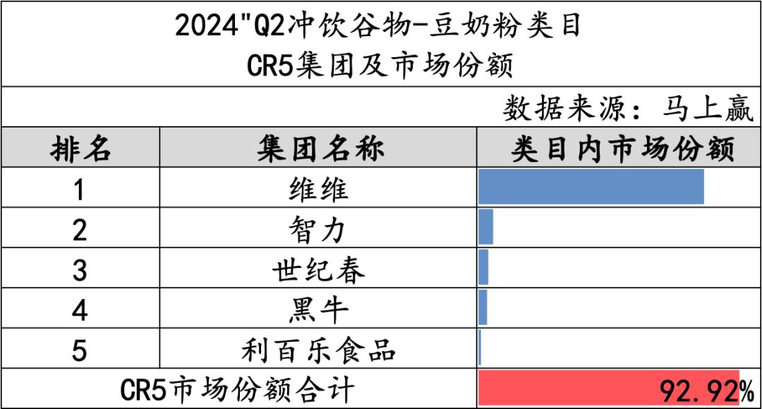 豆奶粉类目的CR5市场份额达到了92.92%,反映出市场的高度集中。维维品牌在豆奶粉市场中占据绝对领先地位,其市场份额远超其他品牌,展现出强大的市场支配力。紧随其后的是智力、世纪春和黑牛,这些品牌之间的市场份额差距不大;排名第五的利百乐食品市场份额相对较低,但仍然跻身CR5之列。
