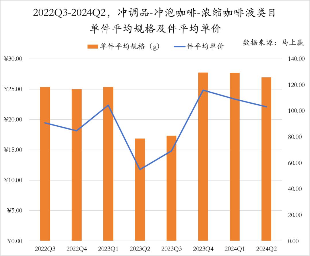 从2022年第三季度到2024年第二季度,浓缩咖啡液类目的平均规格和平均单价总体上呈现出上升趋势。尽管在2023年第二季度和第三季度出现了明显的下降,但随后迅速回升,平均规格和平均单价都超过以往。